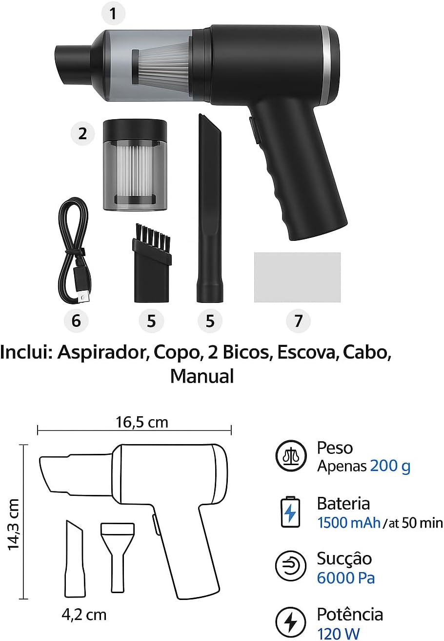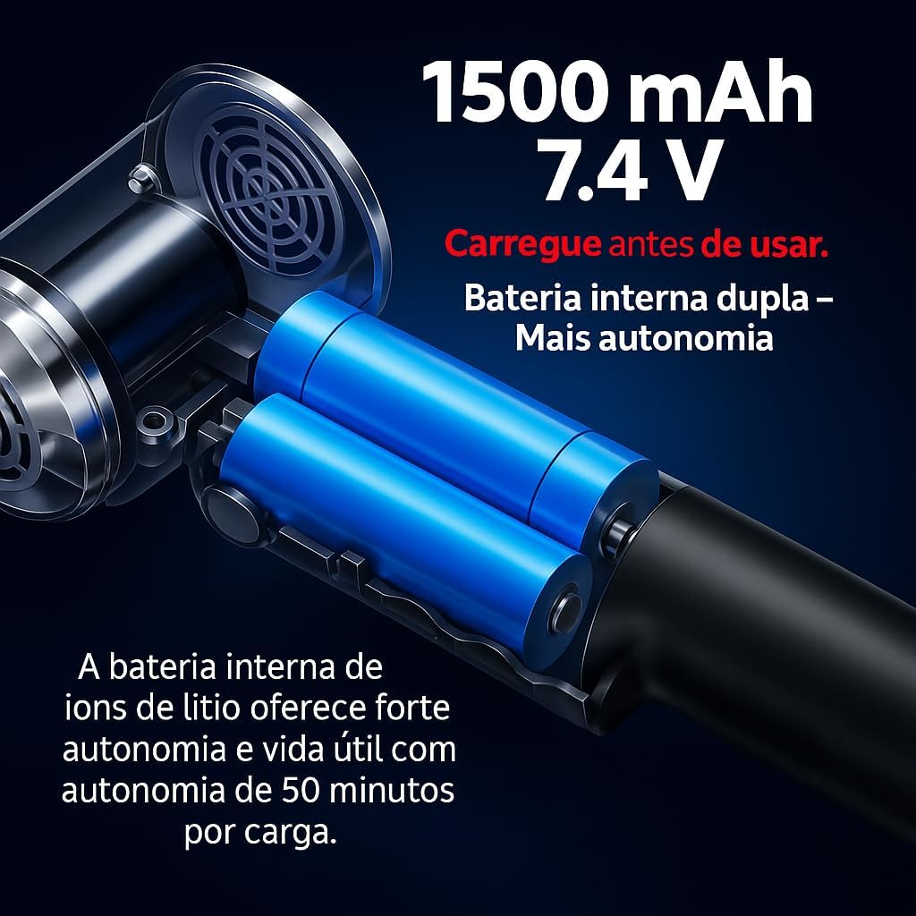 Com o carregamento USB universal, você pode usar seu aspirador em casa, no carro, no trabalho ou até conectado ao powerbank. Nunca fique na mão quando precisar de uma limpeza rápida.